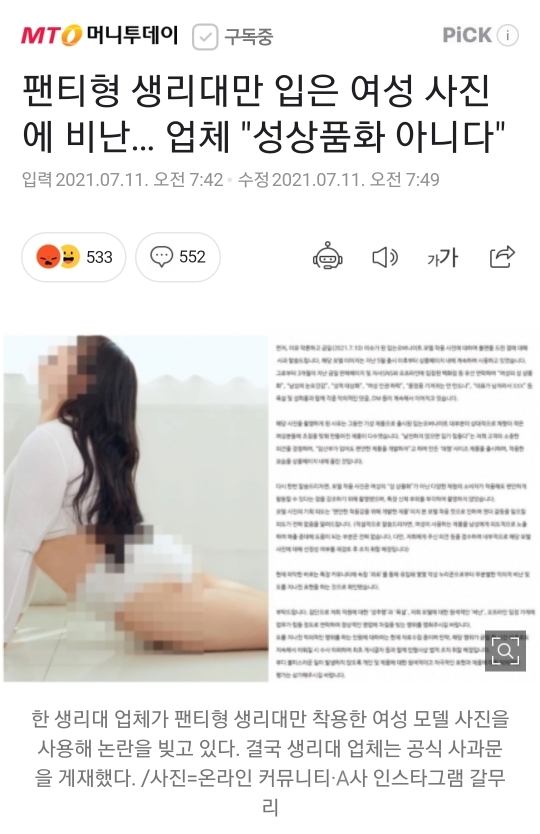 업체는 지난달 모델이 팬티형 생리대를 착용하고 포즈를 취하는 사진을 sns에 게시했다.